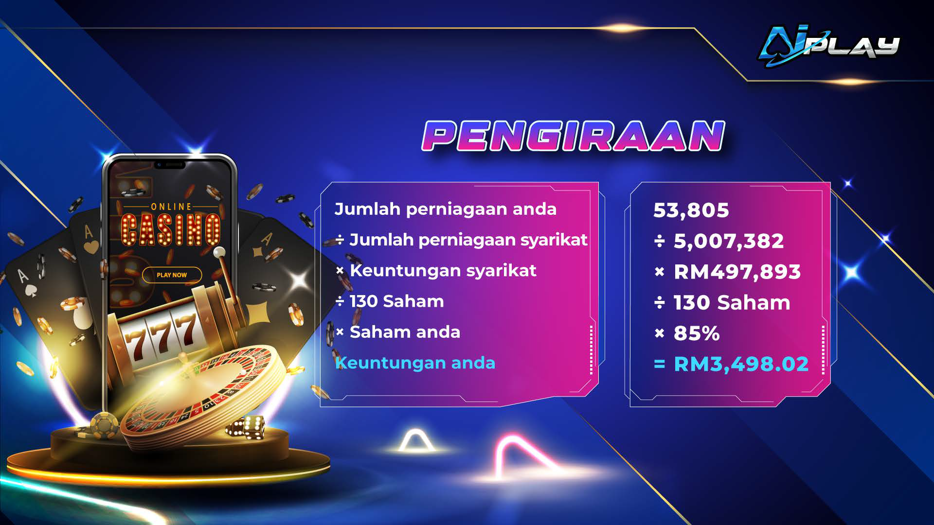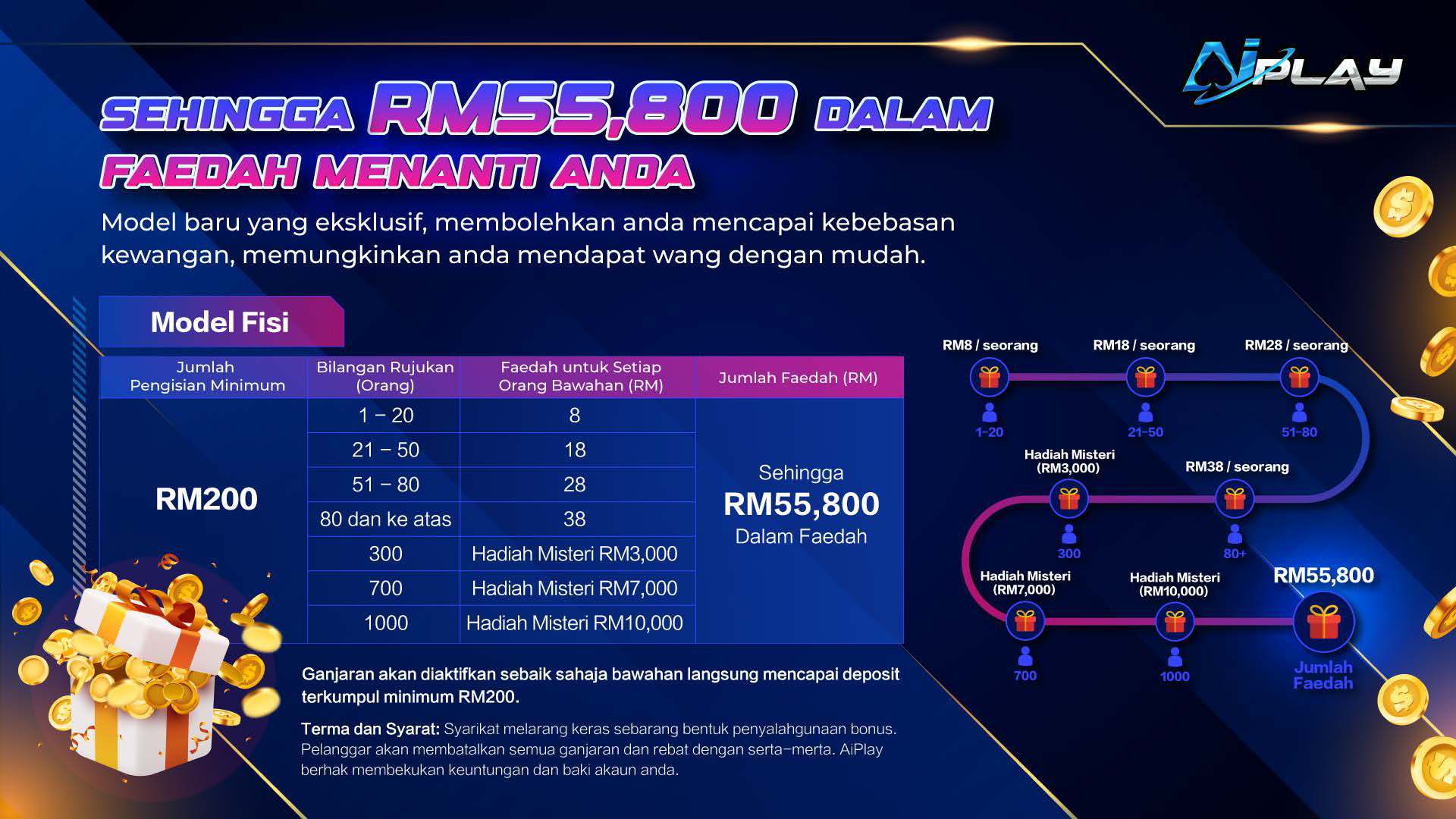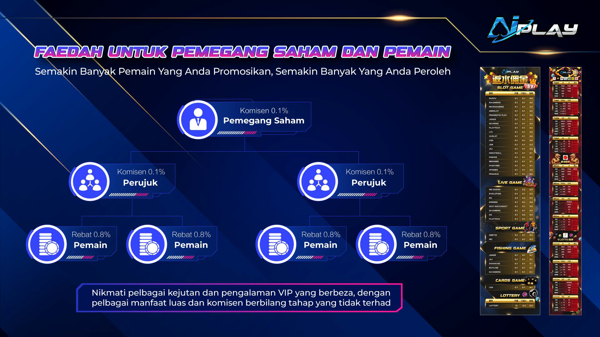 Daftar dengan AIPLAY hari ini sebagai ejen kami dan nikmati komisen yang murah hati dengan mempromosikan platform kasino dalam talian terkemuka di Malaysia!